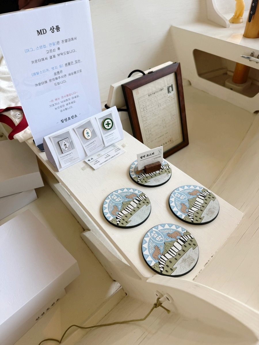 - 1층: 주문 카운터, 베이커리와 굿즈 판매 공간이 있습니다. 작은 배 모양의 굿즈 전시대로 정체성을 잘 드러냅니다.