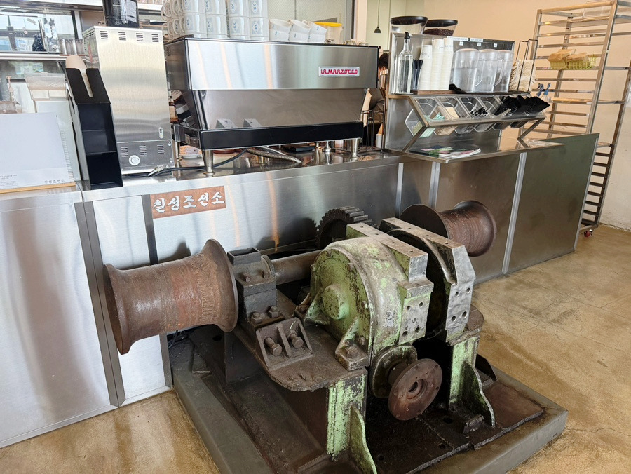 도시재생의 일환으로 문화예술공간으로 재탄생해, 마당의 레일과 오래된 공구, 배 관련 소품들이 인테리어로 자연스럽게 녹아 있습니다.